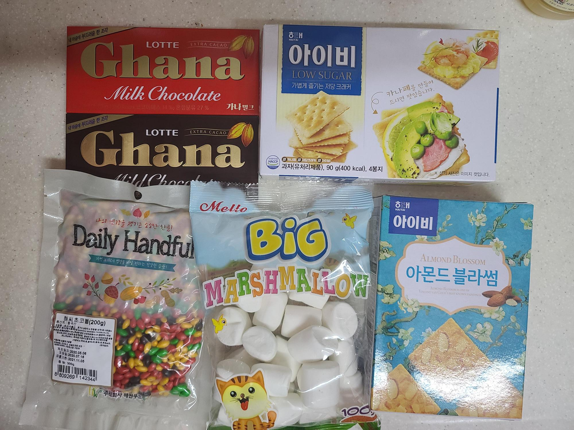 초콜릿은 큰 사이즈로 사는 것이 아이비 사이즈에 딱 맞아서 좋았습니다. 아이비는 아몬드 블라썸이 더 이뻐서 아몬드 블라썸도 샀는데 일반 아이비가 활용은 더 편합니다. 마쉬멜로우는 하얗고 적당히 큰 것으로 준비해주시면 됩니다! 이 외에도 안에 초콜릿을 더 넣거나, 견과류를 넣거나, 바나나 등을 넣으실 수 있습니다.